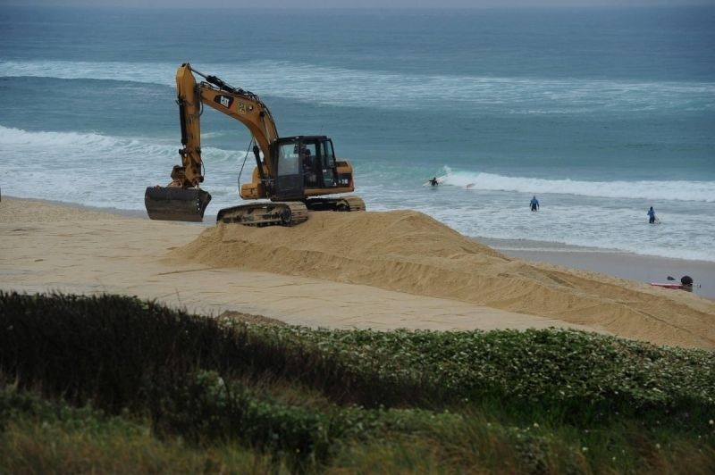 Après la série de tempêtes de cet hiver, la ville de Biscarrosse a du reconstituer les pieds des dunes sur 1 km et les accès à la plage © Frank Axel