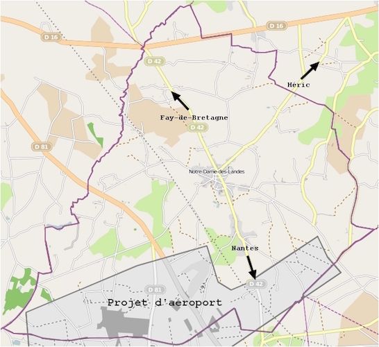 À Notre-Dame-des-Landes et ses communes voisines du département de Loire-Atlantique (44), à 20 kilomètres au nord de Nantes et à 40 km à l’est de Saint-Nazaire. Le site retenu est dans l’un des derniers bocages intouchés de la région et prévoit une emprise au sol de 1.650 hectares – pour la plupart des terres agricoles, dont 400 ha aujourd’hui encore travaillées par quelques paysans sous la menace de l’expropriation et 800 autres ha potentiellement exploitables (lire ici). Au total, près de 50 exploitations et 600 emplois agricoles seraient affectés par le projet, selon les estimations. La construction de l’aéroport occasionnerait également la destruction de deux zones naturelles classées d’intérêt écologique, faunistique et floristique (Znieff). En avril 2013, le comité permanent du Conseil national de la protection de la nature – organe consultatif du ministère de l’Écologie – avait recommandé deux années supplémentaires d’études complémentaires (lire ici). Qui n’ont pas été menées.