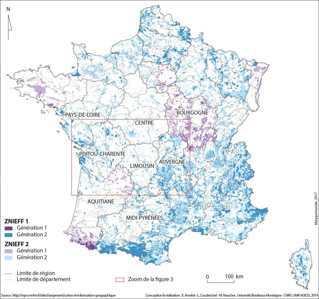 Les territoires sont à la fois une construction sociale et une matérialité signalait l’appel à communication du colloque 2014 du Collège International des Sciences du Territoire (CIST)2 dont est issu ce dossier thématique de M@ppemonde. De ces deux volets d’une même réalité, les sciences de la nature privilégient la matérialité lorsqu’elles proposent leur recours vis-à-vis des politiques de conservation. La nature est alors précisément décrite, selon des protocoles scientifiquement validés, mais sur les espaces réduits faisant l’objet des zonages de protection. Pour le reste, les pouvoirs publics récupèrent « à la volée » des données existantes sur des lieux, des sites ou des territoires ; données qui peuvent, ou non, passer au crible de structures de validation, le Museum National d’Histoire Naturelle (MNHN) notamment, avant d’intégrer des bases d’informations plus institutionnelles. C’est ainsi que s’est structuré le fichier Znieff3, véritable fondement de la connaissance officielle de la biodiversité en France (Couderchet et Amelot, 2010).