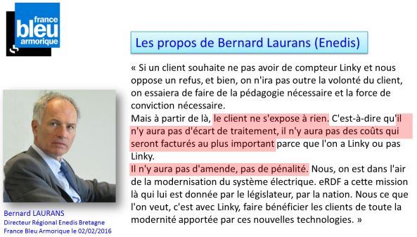 Bernard Laurans, Directeur Régional d’Enedis (ex eRDF) Bretagne affirme en direct sur l’antenne de Radio Bleu Armorique que Linky n’émet aucune radio-fréquence.