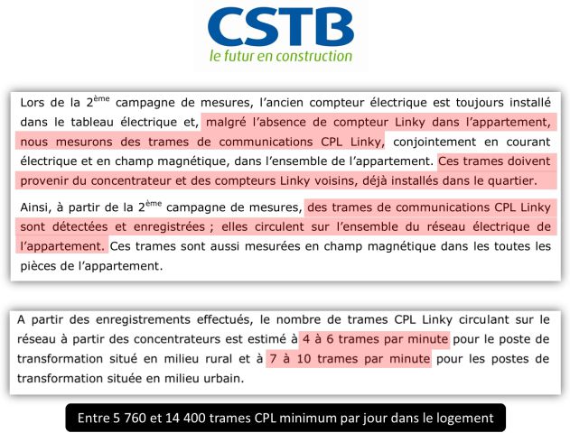 L’étude du CSTB, réalisée in-situ sur quelques logements dans la banlieue de Grenoble, confirme clairement que même les personnes n’ayant pas de compteur Linky reçoivent les rayonnements du CPL générés par les Linky et concentrateurs du voisinage proche.