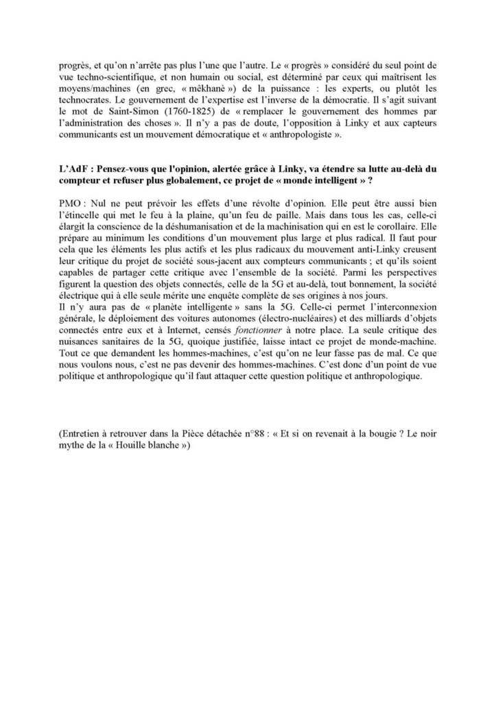 Cet entretien conclut un dossier de huit pages consacré à l’oppression numérique, c’est-à-dire aux manifestations de la société de contrainte sur lesquelles nous enquêtons depuis 2001. Ainsi le téléphone portable, alias smartphone, instrument d’aliénation, de surveillance et de destruction massive (Cf. Le téléphone portable, gadget de destruction massive, éditions L’Echappée, 2008) ; les puces communicantes RFID et la police totale qui infestent rapidement tous les objets fabriqués et tous les êtres vivants afin de les tracer – animaux domestiques (chiens, chats, moutons), objets et papiers personnels, et maintenant de plus en plus d’humains eux-mêmes, notamment des salariés (Cf. RFID : la police totale. Puces intelligentes et mouchardage électronique, L’Echappée, 2008). Et puis Linky, le capteur communicant d’Enedis, autant destiné à aspirer les données de 35 millions de foyers qu’à réguler de manière autoritaire leur consommation d’électricité. Internet, big data, algorithmes, IA, etc. Et mon tout est un homme-machine dans une maison-machine dans une ville-machine dans un monde-machine. Un emboîtement de machines intégrées les unes dans les autres, en vue d’un fonctionnement optimal.