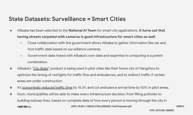 L’Electronic Privacy Information Center (Epic) a récemment eu accès, grâce à une demande de liberté d’information (FOI), à la présentation faite au NSCAI par Schmidt en mai 2019. Ses diapositives présentent une série d’affirmations alarmistes sur la manière dont le laxisme de la réglementation en Chine et son appétit sans limite pour la surveillance lui permettent de devancer les États-Unis dans un certain nombre de domaines, notamment l’Intelligence Artificielle pour le diagnostic médical, les véhicules autonomes, l’infrastructure numérique, les « villes intelligentes », le covoiturage et le commerce sans numéraire.