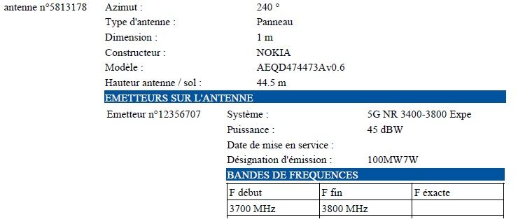 Ce site d’antenne a la particularité d’avoir une antenne 5G installée (pas encore en émission) en plus des antennes 2G, 3G et 4G habituelles (en émission). La bande de fréquence réservée pour l’opérateur Orange se situe entre 3700 et 3800 MHz.